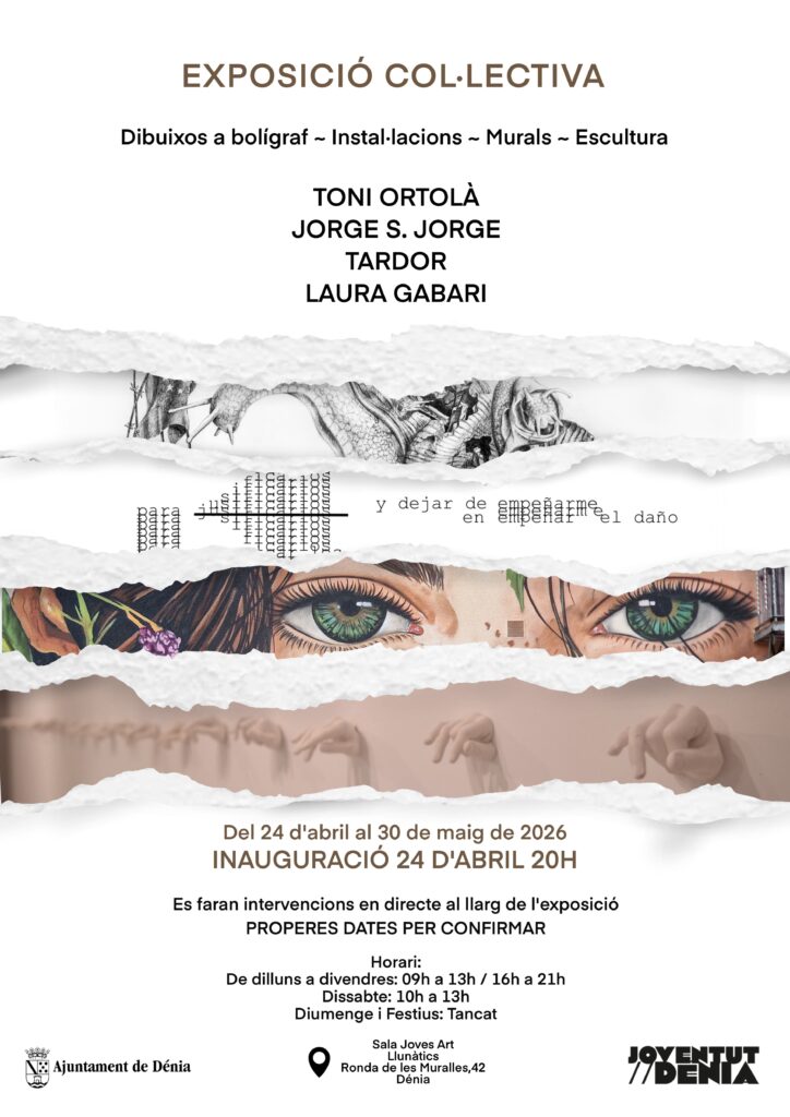 Cuatro artistas Toni Ortolà, Jorge S. Jorge, Tardor y Laura Gabari inaugurarán este viernes, 24 de abril, a las 20:00h la “Exposició Col·lectiva” en la Sala Joves Art Llunàtics, consolidándose como una de las citas culturales destacadas de la primavera en Dénia.