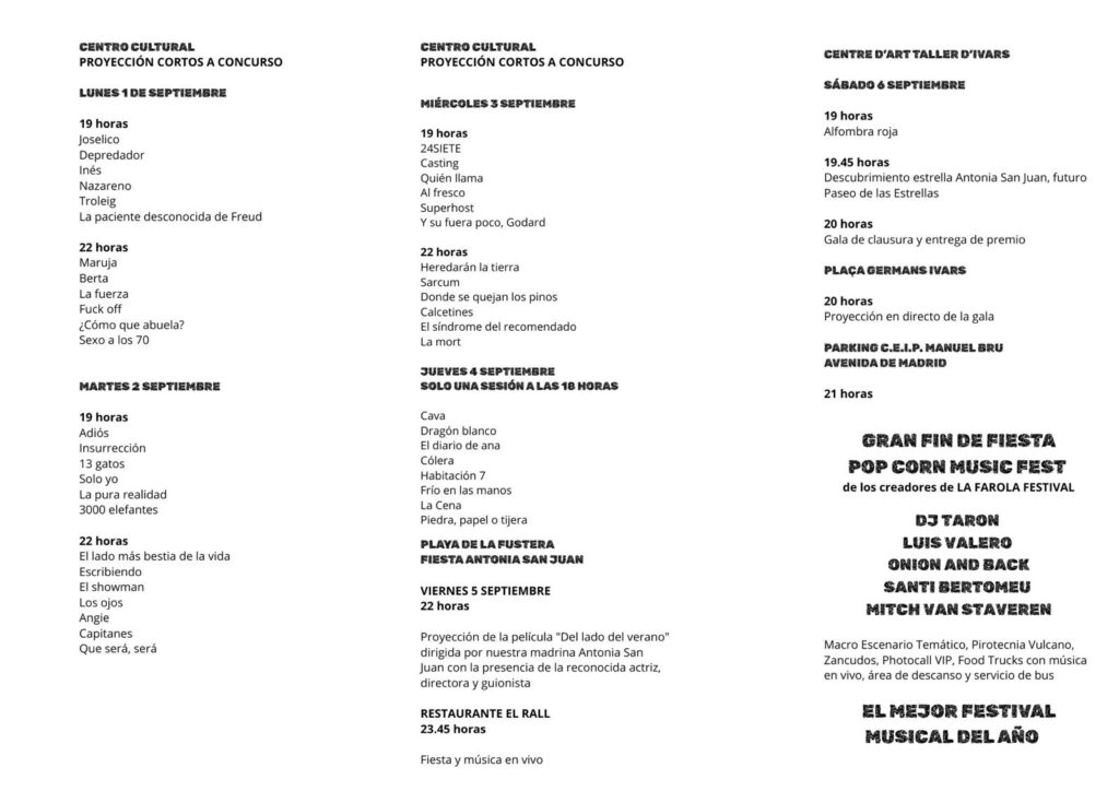 Seguirán las proyecciones el martes y miércoles con el mismo horario, mientras el jueves será a las 18:00h. Con la finalidad de dar a conocer distintos enclaves de Benissa, el viernes, 5 de septiembre, los focos y los flashes estarán en la playa de la Fustera donde a las 22:00h la madrina de esta primera edición, Antonia San Juan, presentará su película “Del lado del verano”.