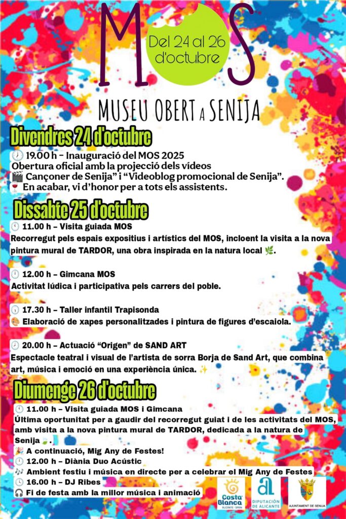 En esta edición, el MOS se celebrará los días 24, 25 y 26 de octubre. Arrancaremos, apunta la edil, el viernes a las 19:00h con la inauguración del MOS y dos proyecciones, el “Cançoner de Senija”, que han realizado las mujeres mayores de Senija para la recuperación de canciones de antaño, y videoblog promocional de Senija. Al finalizar, vino de honor para todos los asistentes.