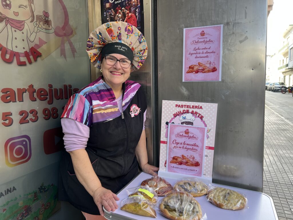 Desde hace tres días, antes de bajar la persiana de su obrador, Julia coloca sobre una mesa toda esa comida que está en estado perfecto, pero que no se ha vendido el día anterior. Su mensaje es claro y honesto, escrito casi sin palabras: coge lo que necesitas, pero no desperdicies. Tartas, bizcochos, dulces que podrían estar en cualquier escaparate… y que aquí esperan una segunda oportunidad.