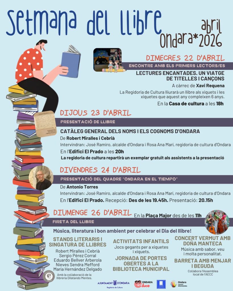 L’Ajuntament d’Ondara, a través de la Regidoria de Cultura, celebra durant tot el mes d’abril el Mes del Llibre, amb una completa agenda d’activitats culturals i educatives dirigides a tots els públics, amb l’objectiu de fomentar l’hàbit lector, posar en valor el patrimoni literari i reforçar el paper del llibre com a eina de coneixement i cohesió social.