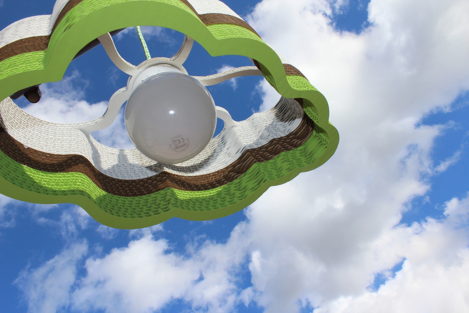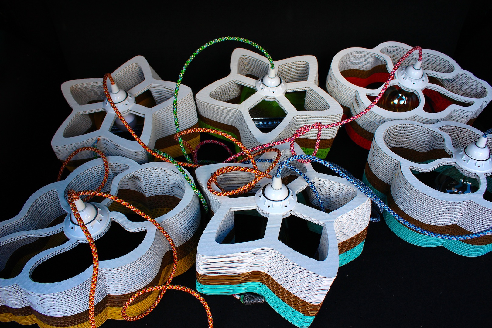 Las lámparas están formadas por una parte blanca que le da un aire más suave; la parte central de cartón, porque hemos querido conservar la esencia de nuestras lámparas, que es este material, y por último, la parte inferior es de color. Hemos elegido cuatro colores: azul, amarillo, rosa y verde, que junto a sus cables a juego crean una divertida combinación.