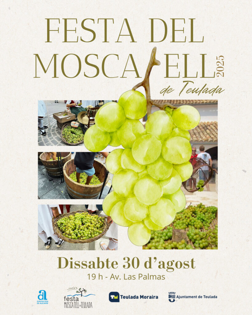 La edil de Cultura comenta que se ha organizado un concurso de fotografía vigente hasta hoy, 28 de agosto. Tan solo hay que subir una imagen a redes sociales (Facebook y/o Instagram) con el hashtag #MoscatellTM25 y etiquetar al Ayuntamiento de Teulada. “El premio son 100€ para consumir en la Fiesta del Moscatell 2025”, apunta Martínez.