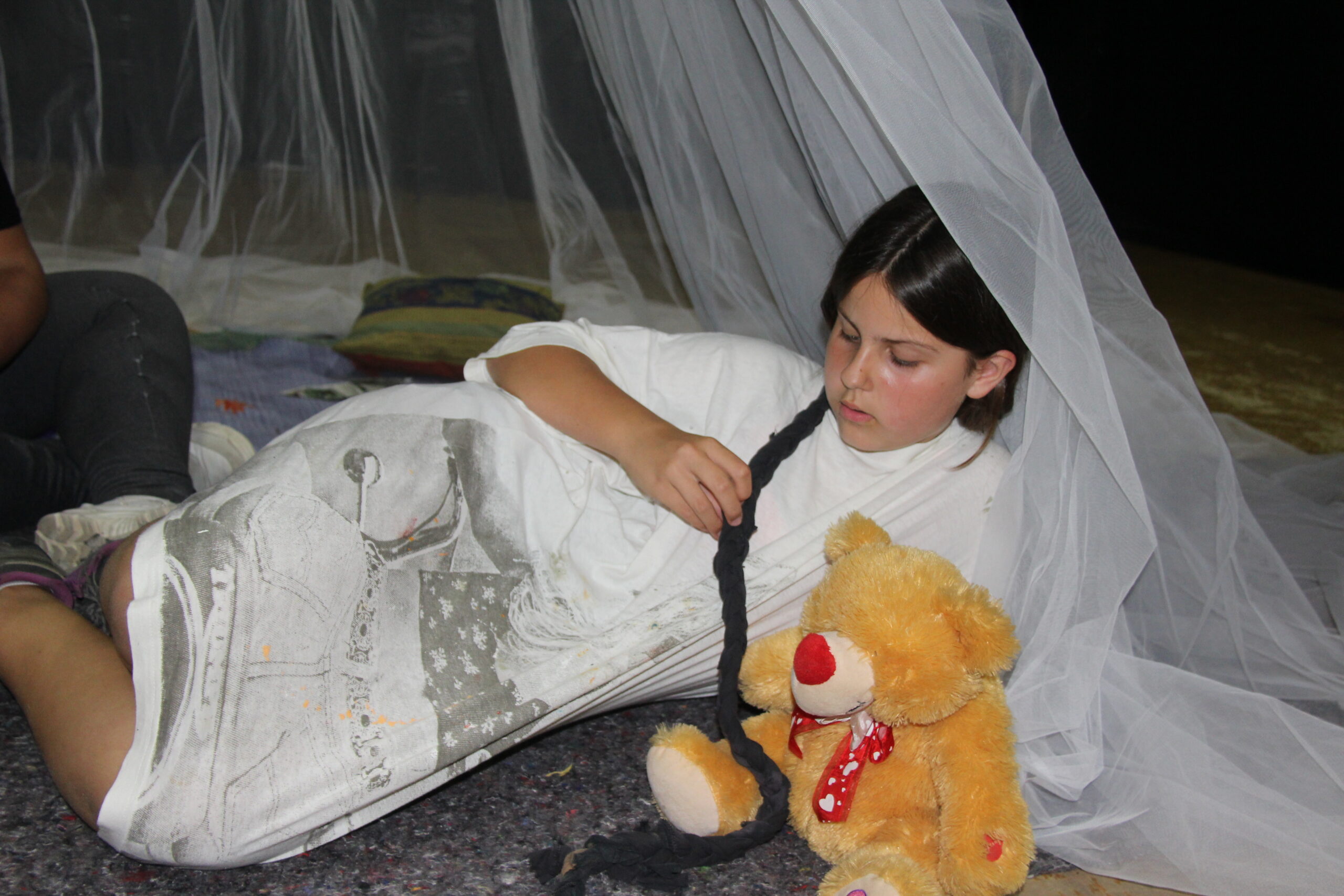 Blanca Pérez, Sara Grimalt y Alexia Ferrando se convierten en tres niñas, unidas por el éxodo de la tienda de campaña del campo de refugiados que las acoge. Tejen su futuro entre la hostilidad del lugar y la complicidad con la cremallera que las protege de la realidad.